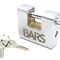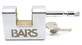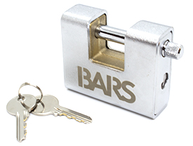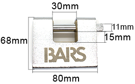 BARS Shutter Padlock - 80mm body width with 11mm shackle thickness. Key and shackle are on the same side of the padlock which makes it perfect for locking storage containers underneath the protective shroud. Brass body with a hardened casing. 5 pin key 2 x Keys supplied with the padlock
