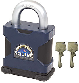 Registered key section = This means that the keys are the Squire Registered key section and these harder to get cut so normal key cutters will not be able to cut these. Only registered Squire dealers can get the key blanks. They are not FULLY restricted as registered dealers can cut them but they are a nice way of controlling the keys in circulation The Squire Stormproof SS65 is the highest security padlock with protective weather cover. The padlock is designed to withstand harsh weather conditions but also offer extremely high levels of security. Designed for use on warehouses, perimeter gates, heavy goods vehicles, trailers, high security doors. Hardened boron alloy steel shackle resists cutting. Rekeyable 6 pin cylinder over 250,000 key differs Anti-bump , Anti pick cylinder is highly attack resistant Highly corrosion resistant Electrophoretic black coating with the added weatherproof cover offers great weather protection. CEN Rated 5 Available keyed alike and masterkeyed 2 x Keys Supplied with the Padlock when ordered keyed differ !!<