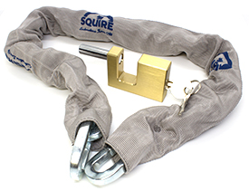 Squire Y3 Case Hardned Chain = 900mm Length = 10mm Link BARS Brass Block Padlock = 70mm width = 12mm shackle Perfect bicycle chain and padlock set as they are a light weight 2.2kg total. Also great to secure gates and mid range security use. 2 x Keys supplied with Padlock - Additional keys can be purchased below All Padlocks are supplied keyed differ so different keys for each.