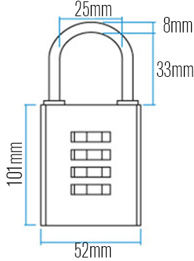 Four digit resettable coded mechanism. Shackle made from hardened steel. Solid die-cast zinc body. Low to medium security requirement where convenience of use is a high priority (e.g. schools, companies) - Tough die cast body : Durable security - 4 digit (50mm) resettable combination : Set your own PIN - Hardened steel shackle : Resists hacksaw attacks