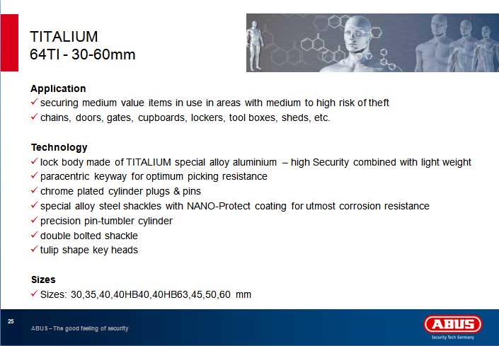 TITALIUM locks by Abus represent a new dimension in security and represent a high level of security whilst weighing signifantly less (30%) than comparable locks. This is all thanks to the innovative material of which the locks are made, namely a special aluminium alloy that uniquely combines a high level of torsion with lightness. The TITALIUM locks have a modern stainless steel finish, and offer both maximum strenght & low weight.