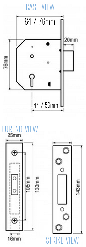 There are 2 different sizes of lock cases as each lock will give you a different backset. This is the distance from the edge of the lock to the keyhole / spindle for handles. The bigger locks are better for solid wooden doors as they move the keyhole away from the door stop further. If you have a large door stop and fit a 64mm lock case you can find that you hit your knuckles on the door stop when you turn the key. Alternatively the 64mm lock case is better when you have a glass panelled door as you may not have enough wood on the stile to fit the 76mm lock into before you hit and therefore smash the glass. This is very important to check when installing locks to doors with glass in.
