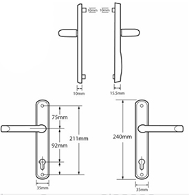 The Asec Kite Secure handle range combines visible security features with concealed reinforcement technology, providing ideal protection against cylinder and handle snapping. Only for use with Multi-point locking mechanisums with 92mm centers (if in doubt contact us) Features Anti-drill rotating disc shields the front of the cylinder Anti-snap intergrated cylinder guard Anti-grip chamfered backplate shoulders provides mole-grip resistance 3 Star Rating if used in conjunction with the Kite Anti-snap cylinder M6 hardended Steel screws for extra strength Steel reinforcemnet technology concealed within the backplate Reversable handing so can be used on all UPVC doors with 92mm centers. May require new drill holes in the plastic, check our additional information for dimensions Available in White, Brass and Silver finish