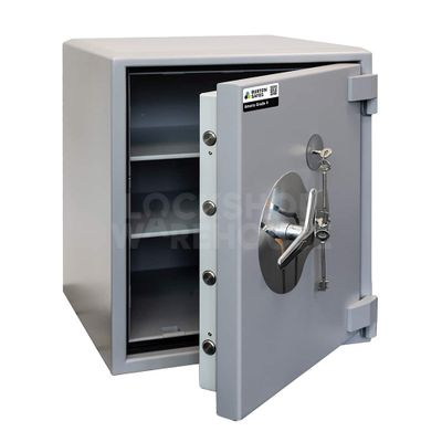 Security features include a 50mm thick steel door with a 55mm back pan cover, secured by a 3-way locking mechanism with 25mm diameter bolts. For additional protection against hinge-side attacks, a solid dog bolt is integrated into the design. The safe is equipped with two high-security 11-lever double-bitted key locks as standard, both of which are VdS class 2 and EN1300 certified.