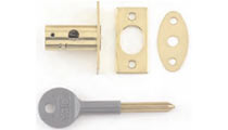 Surface mounted bolt with a large slide bolt, requires key to lock and unlock.