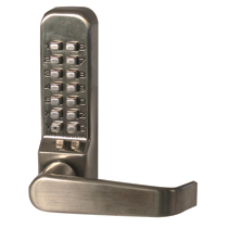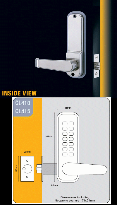 The outside lever handle will retract the latch when the correct code is entered. The 415 is supplied complete with a tubular spring loaded latch (Medium duty, stainless steel latch bolt head with anti-shim plunger, 8mm follower. 60mm backset, requires 25mm hole, (82mm deep.)which will lock automatically when the door is closed.