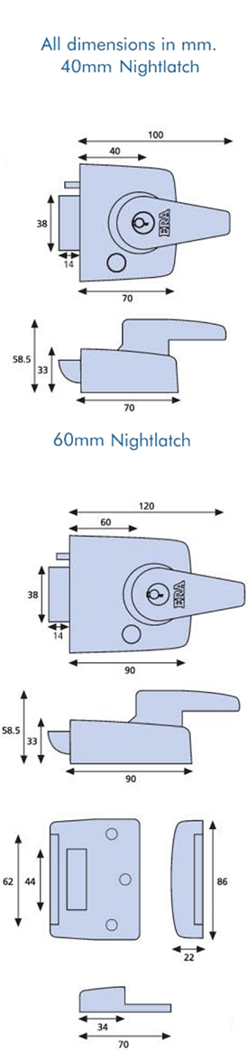 The ERA Double Locking Nightlatch is available in both 40mm and 60mm backset, designed to replace most existing front door locks. The product is ideally suited for solid and glass panelled wooden doors, as it has been designed with an ergonomic internal locking handle offering added security against forced entry. The main lock bolt is automatically deadlocked when the door is closed, preventing the main bolt being retracted by a credit card. The inside handle can be deadlocked by an anti-clockwise turn of the key from the inside so securing the lock against forced entry. The bolt can be held in the withdrawn position (only) with the use of the snib feature. The nightlatch case is available in brassed and a new range of chrome finishes, with matching brass and satin rim cylinders. The bolt cannot be reversed.