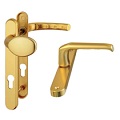 The unsprung lever handles is fixed to the back plate by design and is reversible Fixed lugs are fitted onto the backplates to secure the handles and give a better fixing. Each handle comes with 2 lugs and work with bolt through fixings (supplied) Handles to suit lock types: FUHR, AGB, Asgard, KFV, Maco, Roto, Winkhaus, GU, Lockmaster, Mila Available in gold finish only Centres : 92mm Spindle : 8mm Distance between screws: 122mm