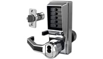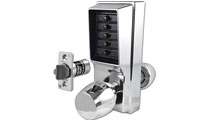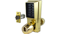 Probably the most sophisticated mechanical digital combination lock of its type. Five button combination chamber design enables the heavy duty deadlocking tubular latch to be withdrawn via the knobset.