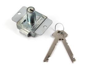 Case height: 67mm Case Width: 43mm Case Depth: 14mm Nozzle Projection: 28mm Backset: 22mm Finish: Bright Zinc Keys Supplied: 2 Surface mounted onto the inside of the door. Bolt is locked and unlocked by key from outside only. Designed for use on steel lockers and cupboard doors. Available with different length Nozzles for thicker doors.