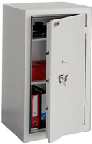 The Steel Stor range of cabinets provides secure storage for larger items such as bags of change, cartons of cigarettes, power tools and mobile phones. Subjected to a severe FG burglary test, the 4mm steel body, a 3-way locking bolt and a VdS approved class 1 safe lock are supplemented by a continuous dog bar over the hinged side of the door and hardened plates to protect all other areas prone to attack. Available in six sizes with alternative locking options, the cabinet is supplied with prepared base fixing points, shelves and door boxes. Steel Stor has a £3,000 cash rating and a £30,000 valuables rating.