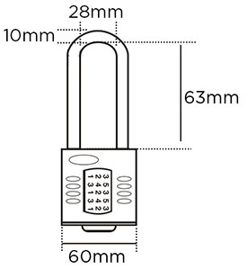 The CP60 high security padlock combines a modern and attractive design with very heavy duty construction, offering the best in durability and resistance to attacks. The CP60 locks feature a hardened steel 10mm diameter shackle, a 60mm wide die cast alloy lock body with dual compound cover and 5 easy to use spaced wheels. These robust recodable combination padlocks deliver heavy duty security without the risk of losing keys. The die cast alloy lock body has a dual compound protective cover for high corrosion resistance and excellent weather protection. The CP60's unique recodable double locking mechanism offers 100,000 combinations and has a push button spring opening mechanism for ease of use. Padlocks from this series are particularly useful for gates, vans, large sheds, garages and commercial buildings. Features Dual compound body cover Recodable 5 wheel combination 60mm die cast alloy lock body 100,000 code variations Hardened steel 10mm diameter shackle Highly resistant to corrosion (excellent weather protection) 63mm long shackle