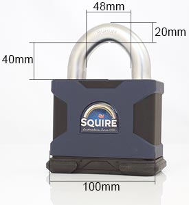 The SQUIRE Stronghold SS100S 100mm open shackle steel lock 2 x 6 pin S cylinder padlock is the world's strongest padlock. The first padlock to ever achieve LPCB Level SR4 (Loss Prevention Certification Board) - which is their highest rating. These massive super heavyweight padlocks are the newest addition to the Squire Stronghold range. Shackle completely removes from the body to make attaching through the hasp and staple or chain easier. There are 2 special products created by Squire to give the best security levels available. The STH100 and the TC22 chain. Please get in touch with us if you are interested in these.