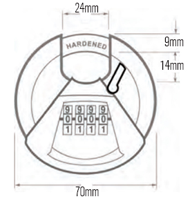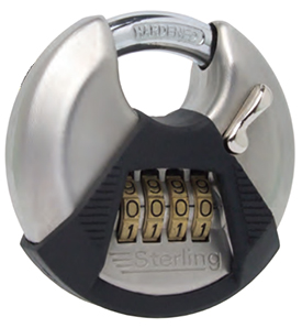 Disc Combination Padlock Laser welded stainless steel body brushed satin satinless steel finish hardened steel chrome plated shackle resettable 4 dial combination Soft protective bumper 10,000 resettable combinations No keys to lose