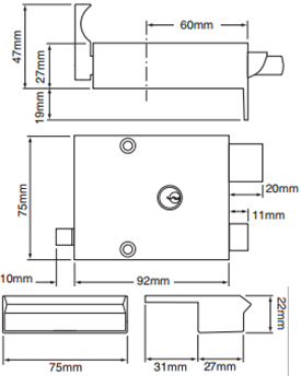 Latchbolt is withdrawn by pull handle inside or key outside. Deadbolt is locked or unlocked by key from either side. One full turn of the key clockwise operates first throw and a second full turn double throws the bolt. Latchbolt can be held back by anti-clockwise turn of the handle whilst bolt is withdrawn. Particularly suitable for glass panel doors. Double throw deadbolt. Mechanism : 5 Pin Cylinder Case Finish : White Enamel with Satin Chrome cylinder or Electro Brass with Brass cylinder Keys Supplied : 3 Door Thickness : 35mm - 60mm