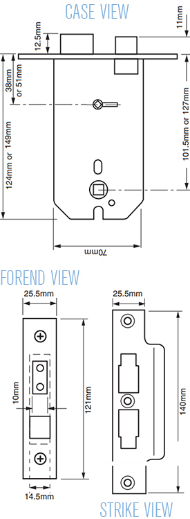 Deadbolt is locked or unlocked by turn from the inside. Reversible latchbolt withdrawn by knob from either side. No keys are used to operate bathroom locks. Bolt is thrown and withdrawn by use of 5mm spindle which requires an additonal turn knob. Pierced to accept bolt through furniture. Case Sizes : 127mm & 152mm Follower : 8mm (Latch) 5mm (Dead) Case Finish : Enamelled Silver Forend Finish : Brass or Satin Chrome
