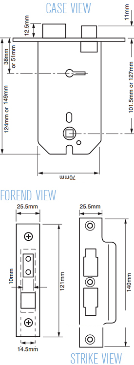 Deadbolt is locked or unlocked by key from either side. Reversible latchbolt withdrawn by knob from either side. Pierced to accept bolt through furniture. Mechanism : 3 Lever Case Sizes : 127mm (5") & 152mm (6") Follower : 8mm (Two Way Action) Case Finish : Enamelled Silver Forend Finish : Brass or Satin Chrome Keys Supplied : 2 Handing - Reversible