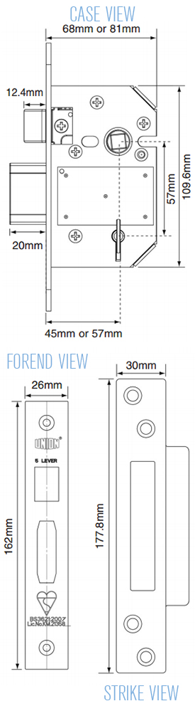 The Union StrongBOLT range has been designed to provide a high level of security at lower prices than the top of the range Union 2234E. It has been tested and approved to British Standards (BS3621:2007) and as such is insurance and police compliant. We have no problem recommending this lock for use on external doors and overall it is of a very strong design and build quality. Further evidence of it's calibre is found in its being granted EN 1634-1 classification, assessed for use on 60 minute timber fire doors. Mechanism: 5 Lever Security Level: British Standard - BS3621:2007 Case Size: 68mm or 81mm Case Finish: Red Forend Finish: Polished Brass or Satin Chrome Keys Supplied: 2