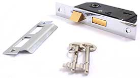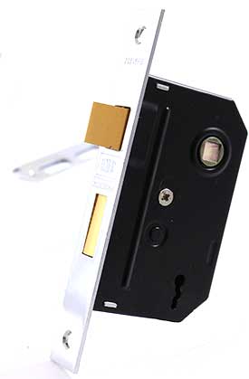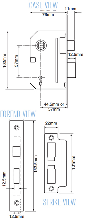 Application: Wooden doors hinged on the left or right and requiring key and lever handle operation. Operation: Two way action suitable for lightweight knobs or sprung handles. Deadbolt locked or unlocked by key from either side. Latchbolt withdrawn by lever handle from either side. Keys suitable for doors up to 55mm thick when using 8mm thick furniture plates. Finish: Finish shown in Polished Brass also available in Polished Chrome. Case Material and Finish: Steel, Black. Forend: Stainless Steel, finished to match strike plate. Striking Plate: Stainless Steel, finished to match forend. Latchbolt/Deadbolt: Aluminium finished Follower: Zinc, 8mm square Keys Supplied: 2 keys. Other Product Benefits: Spare keys and locks available to codes - MH (numbers range from 21 to 40).