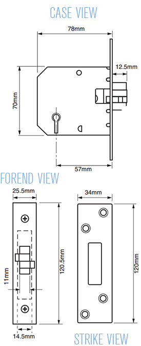 Designed to operate wooden doors hinged on the left or right and requiring key operation only. The claw deadbolt is locked or unlocked by a key from either side. Can be supplied keyed alike with J-2101 and J-2201 Finish: Satin Chrome Case Size: 78mm (3") Case Material and Finish: Steel, Red Enamelled. Forend: Stainless Steel, finished to match strike plate. Striking Plate: Stainless Steel, finished to match forend. Deadbolt: Deadbolt - Brass, expanding claw Keyblank reference KB430.