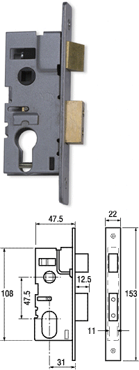 Application: Suitable for residential aluminium doors. 47.5mm case size available. Operation: Deadbolt locked or unlocked by cylinder key or cylinder turn. Latchbolt withdrawn by lever handle. Latchbolt can be withdrawn by key. Suitable for use with narrow plate unsprung lever handles details available upon request. Finish: Satin Chrome Case Size: 47.5mm Case Material and Finish: Steel, Enamelled, Silver. Forend: Stainless Steel, finished to match strike plate. Striking Plate: Stainless Steel, finished to match forend. Latchbolt: Brass.Deadbolt: Brass with hardened steel rollers. Follower: Steel, 8mm square. Cylinder Type & Finish: Euro profile - not supplied. Other Security Features: Can be used with a patented cylinder system.