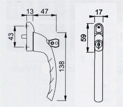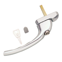 For use with Espagnolette window locks. Handle is easily opened by pushing the button and will operate to the positive stop position at 90°. Handle is automatically locked when closed, and can be deadlocked with the key.Spindle 7mm squareBolt fixing centres 43mm.