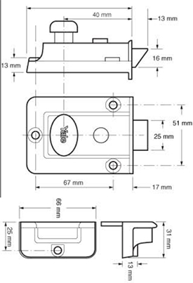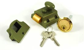 Reversed latch suitable for outward opening doors. Latchbolt is withdrawn by knob from inside and key outside. Bolt and handle can be deadlocked by key from outside or by slide button inside. Slide button also operates latch holdback facility. Latchbolt is easily reversible on site. Reverse strikes available to suit outward opening doors. Mechanism : 5 Pin Cylinder Cylinder Finish : Brass or Satin Chrome Case Finish : Enamelled Nickel Bronze Keys Supplied : 2 Door Thickness : 32mm - 57mm