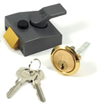 Reversed nightltach. Suitable for outward opening doors. Non-deadlocking from outside. Standard security nightlatch. Narrow width door lock. External: 5 pin key unlock. Internal: Bolt can be deadlocked or held back by slide button, so rendering the lock inoperable by key or handle. Supplied with dark metallic grey case and polished brass or satin chrome rim cylinder