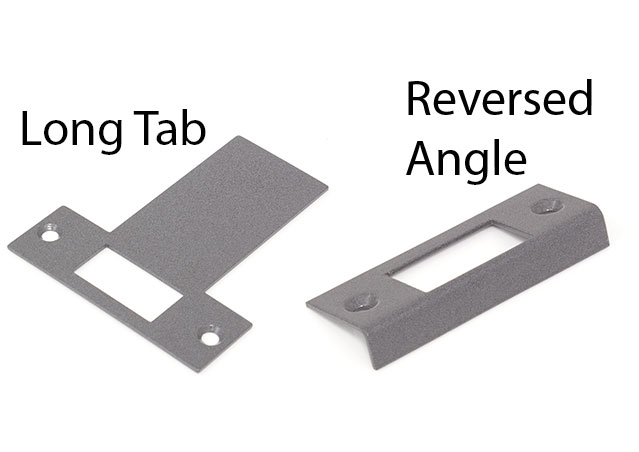 Most nightlatches available for single doors will require an additional strike plate suited for outward-opening doors. These strike plates are either the long tab or reversed angled versions, each fitting in a unique way.