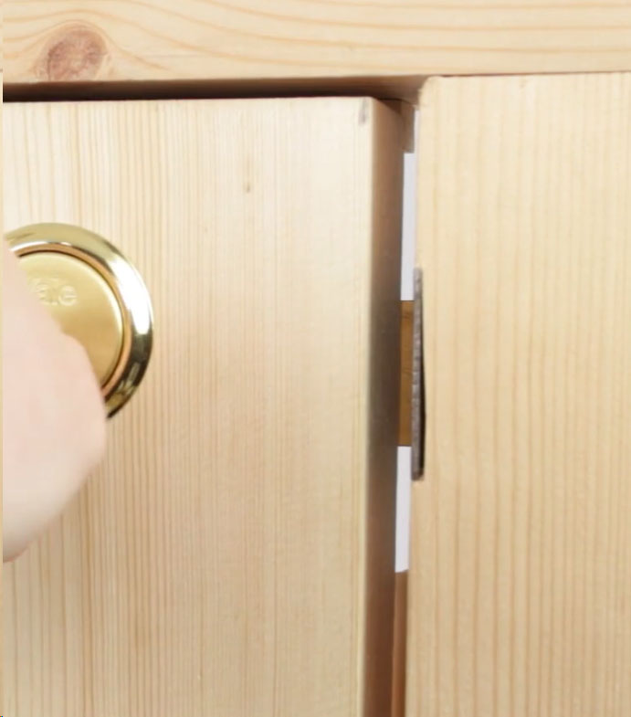 A drawback of this method is that the lock, installed on the inside of the door, will hit the door stop when closed. To resolve this, you must cut away part of the door stop around the lock, leaving a visible gap along the edge of the door (notice the white light leaking through in the image below). This gap can be concealed by attaching an overlapping plate or a piece of wood to the door's exterior.