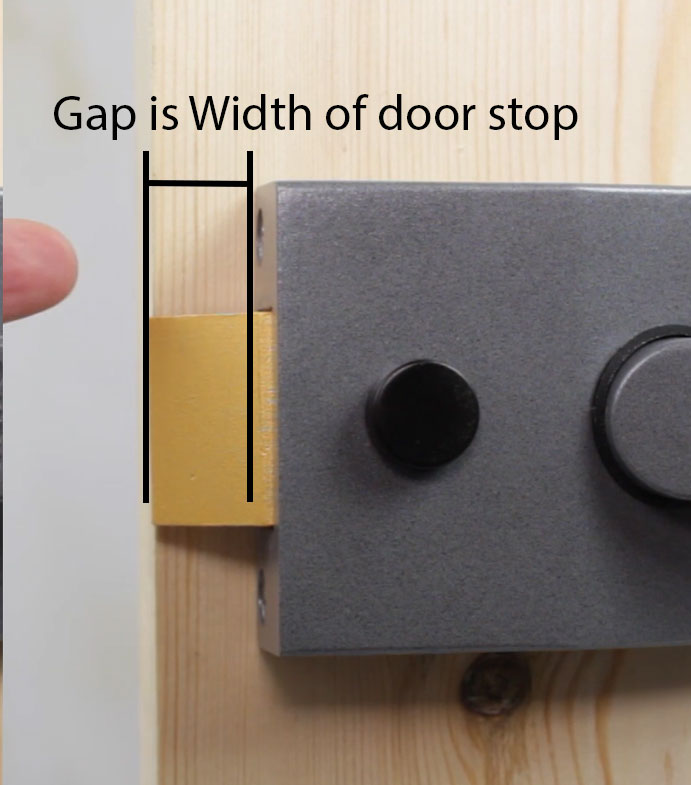 This strike plate is fitted into the door frame by chiseling it flush to the wood. The nightlatch itself is mounted on the edge of the door (either 40mm or 60mm backset, as standard). Since the latch will drag along the door frame, the leading edge of the long tab strike plate protects the woodwork when opening and closing the door.